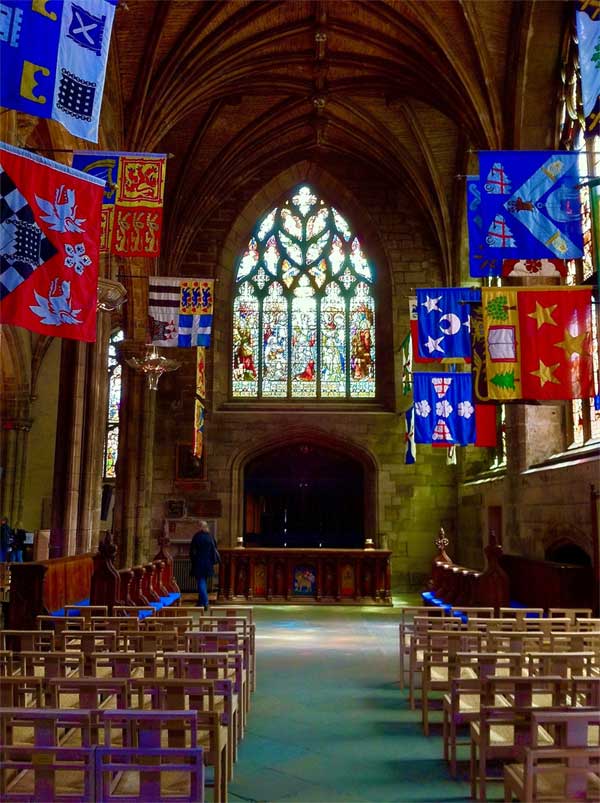 | The Preston Aisle of St Giles Cathedral, with some of the banners of member of the Most Noble Order of the Thistle. | ||